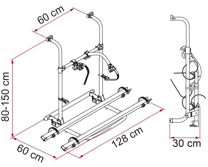 Dzięki dodatkowym przystawkom oraz specjalnemu dolnemu wspornikowi z układem opatentowanej teleskopowej regulacji bagażnik można rozbudować do transportu odpowiednio trzech lub czterech rowerów