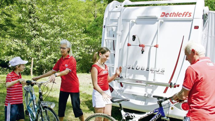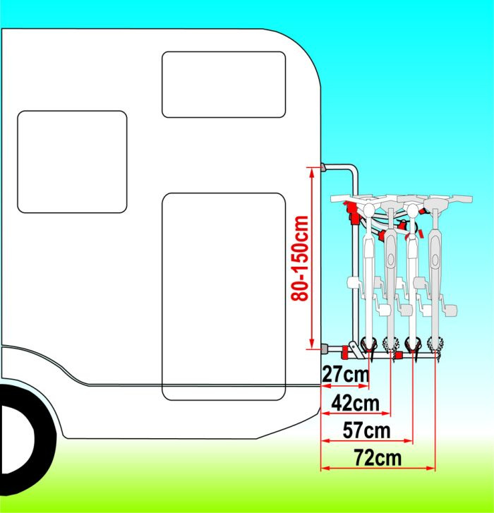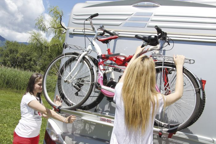 Ekskluzywny, prosty i wygodny w obsłudze, składany bagażnik rowerowy (uchylana platforma z rynienkami), do montażu na tylnej ścianie przyczepy kempingowej lub samochodu kempingowego