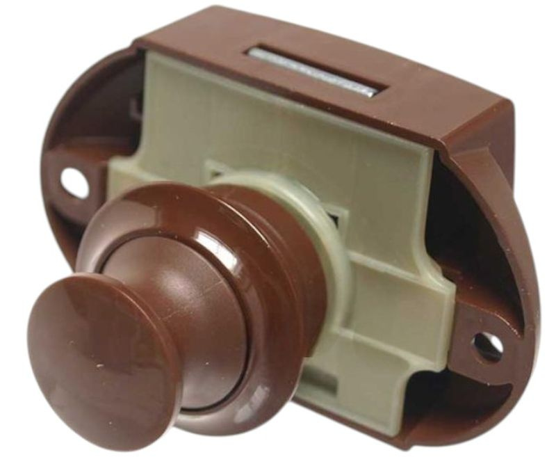 Zamek meblowy wciskany z przyciskiem, rozetka i blaszką brązowy