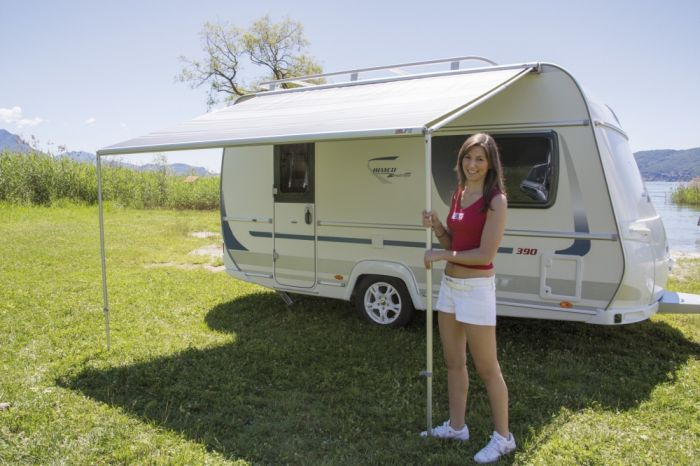 Kompaktowa markiza posiada wytrzymałą konstrukcję wykonana z lekkiego, anodyzowanego aluminium, ręcznie rozkładana
